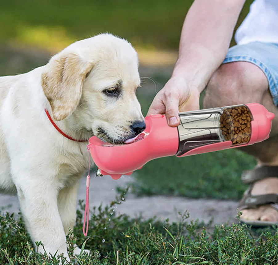 Designed for organized owners and adventurous dogs, this multifunctional water bottle has everything you need for a walk!